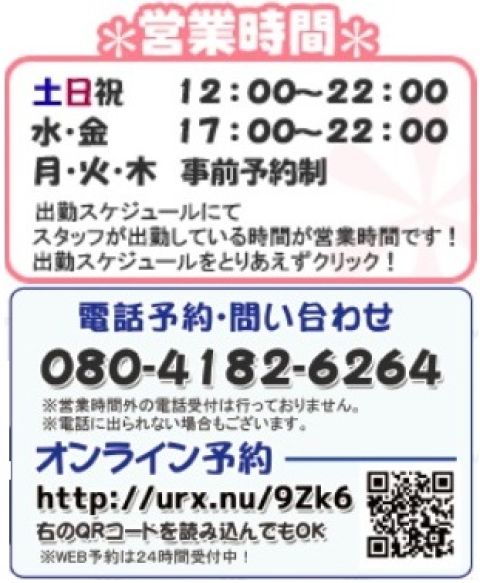 | å¶æ¥æé | æ°Žã»éãïŒïŒïŒïŒïŒïœïŒïŒïŒïŒïŒ åã»æ¥ã»ç¥ãïŒïŒïŒïŒïŒïœïŒïŒïŒïŒïŒ ã«ãŠå¶æ¥ããŠããŸãã ã§ãããã¹ã¿ãããåºå€ããŠããæé垯ã®ã¿ããå¶æ¥ããŠããªããã åºå€ã¹ã±ãžã¥ãŒã« http://egoiste.bambina.jp/mia/c_cms_csv/sch_top.php ã«ãŠãã¹ã¿ããã®åºå€ç¶æ³ã確èªã®äžããæ¥åºãã ããã ãªããåä»ã¹ã¿ãããããæé垯㯠氎ã»éãïŒïŒïŒïŒïŒïœïŒïŒïŒïŒïŒ åã»æ¥ã»ç¥ãïŒïŒïŒïŒïŒïœïŒïŒïŒïŒïŒ ã«ã€ããŠã¯ãåä»ã¹ã¿ãããåžžé§ããŠãããååå¶æ¥ããŠãããŸãã â ã¹ã¿ããã®åºå€ã¹ã±ãžã¥ãŒã«ïŒå¶æ¥æ¥ã§ãïŒâ ã»ã¹ãããâãhttp://egoiste.bambina.jp/mia/c_cms_csv/sch_top.php æºåž¯ãâãhttp://egoiste.bambina.jp/mia/c_cms_csv/i/sch_top.php | ||||||||||||||