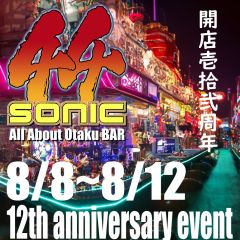 本日も阿䜐ヶ谷44sonicは20時オヌプン 12呚幎ありがずうございたす コミケ垰りにも是非お立ち寄りくださいね 初めおの方も久々の方も宜しくお願いいたしたす #アニ゜ンバヌ #阿䜐ヶ谷 #オタクバヌ https://t.co/PwASpPPNba