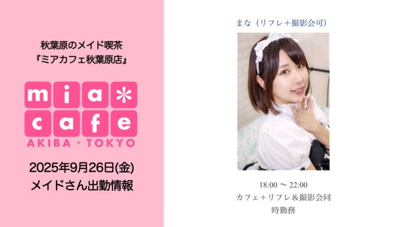 👑本日9月12日(金)総合案内👑 🎀ミアカフェ秋葉原店🎀 おやすみ→次回9/13(土)、14(日)、15(月祝) 🎀ミアカフェ山梨店🎀 🍀本日18:00〜22:00オープン🍀 🎀ミアカフェ浜松店🎀 🍀本日18:00〜22:00オープン🍀 🎀ミアカフェ静岡店🎀 おやすみ→次回9/13(土)、14(日) #メイドカフェ https://t.co/w4eZOuo0M0