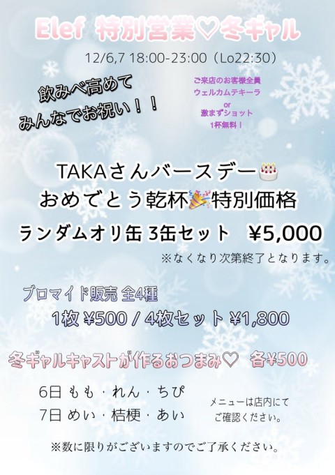 12/6(土) 〜本日のElef〜 Bar time OPEN18:00 CLOSE 23:00(Lo22:30) もも@_momelody めい@ME1_chaaan れん@_renchama ちぴ@CHIPIHIME_ あんり@xr_l0chu 皆様のご来店 心よりお待ちしてます! 近日イベント予定 12/6,7 特別営業♡冬ギャル 12/21 ももめろ生誕 eve https://t.co/Qd4dBUiOpR