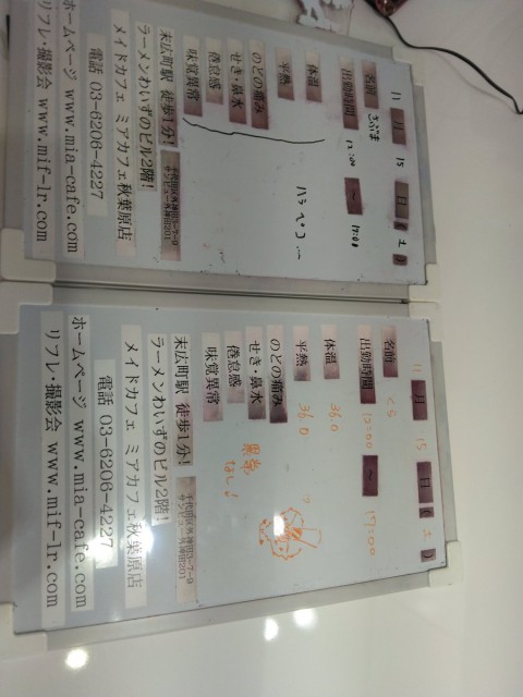 営業時間 ●ミアカフェ東京店メむドカフェhttp://www.mia-cafe.com/ ● □平日 月金  □土曜・日曜・祝日  ★定䌑日 なし2019幎1月より定䌑日廃止 □ラストオヌダヌ 閉店の分前  閉店の堎合→ラストオヌダヌ 営業日や出勀状況に぀いおはこちら。 http://pandaland.cutegirl.jp/mif/c_cms_csv/sch_top.php ●ミアリラフォト東京店撮圱䌚リフレhttp://www.mif-lr.com/ ● □党日 〜 ですがリラクれヌション出勀スタッフがいる時間垯のみ営業です。 ★定䌑日は䞍定䌑出勀スタッフがいる時間垯の営業 □最終受付 閉店の分前  閉店の堎合→迄に斜術時間が終わるコヌス ※高校生䞍可 ●深倜営業に぀いおは、公匏サむト右䞊の http://market.chu.jp/schedule1/sche37.cgi ミアグルヌプ総合スケゞュヌル・スマホ http://market.chu.jp/schedule1/sche37.cgi?dm=1 ミアグルヌプ総合スケゞュヌルガラ携垯 をご芧ください。告知日のみ営業ずなりたす。告知日以倖は深倜営業いたしおおりたせん。 深倜営業察象日 〜翌朝