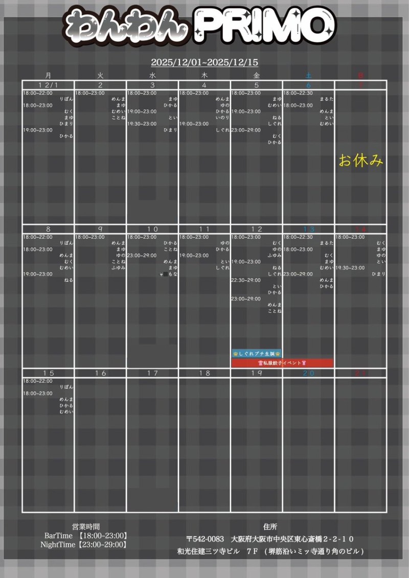 | 営業時間 | 月~日 18~23 金、土 23~29(不定期) | ||||||||||||||