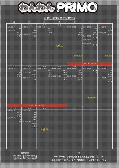 ━━━━━━━━━━━━━━━ 🐾わんわんPRIMO🐾 🦴12月後半お給仕予定🦴 ━━━━━━━━━━━━━━━ 🍶なくなり次第終了 甘酒イベント ☁️18日 店休日 🎄19-25日 クリスマスイベント 沢山のご帰宅お待ちしております❕ https://t.co/7khynZCY1c