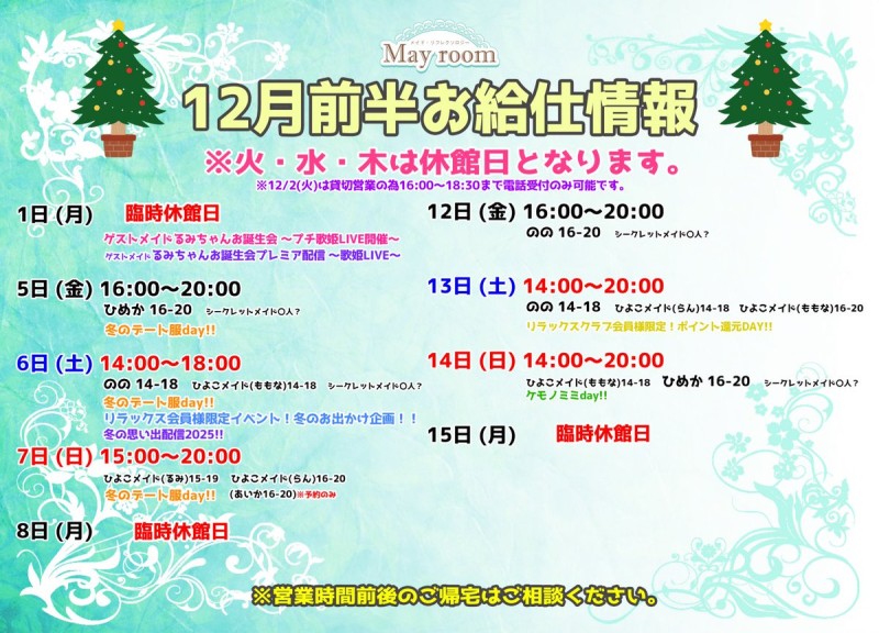 ð2025幎12æ1æ¥ïœ15æ¥ å¶æ¥æ¥ïŒã¡ã€ããçµŠä»æ