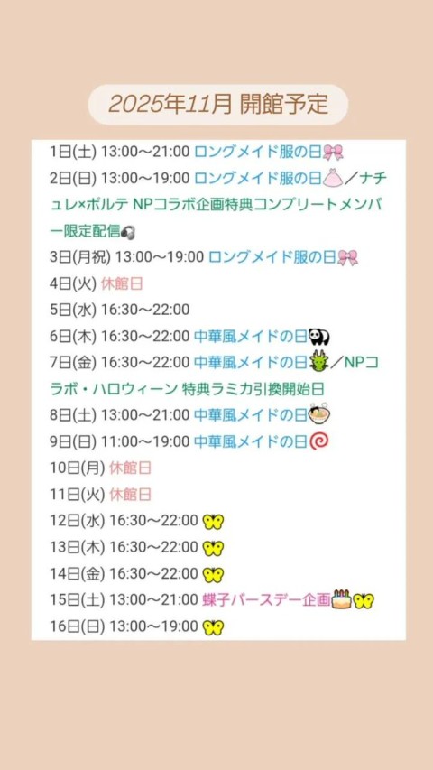 | å¶æ¥æé | æç« äŒé€šæ¥ïŒå¹³æ¥ 15:30ïœ22:00ïŒåæ 13:00ïœ21:00ïŒæ¥æ 13:00ïœ19:00 | ||||||||||||||